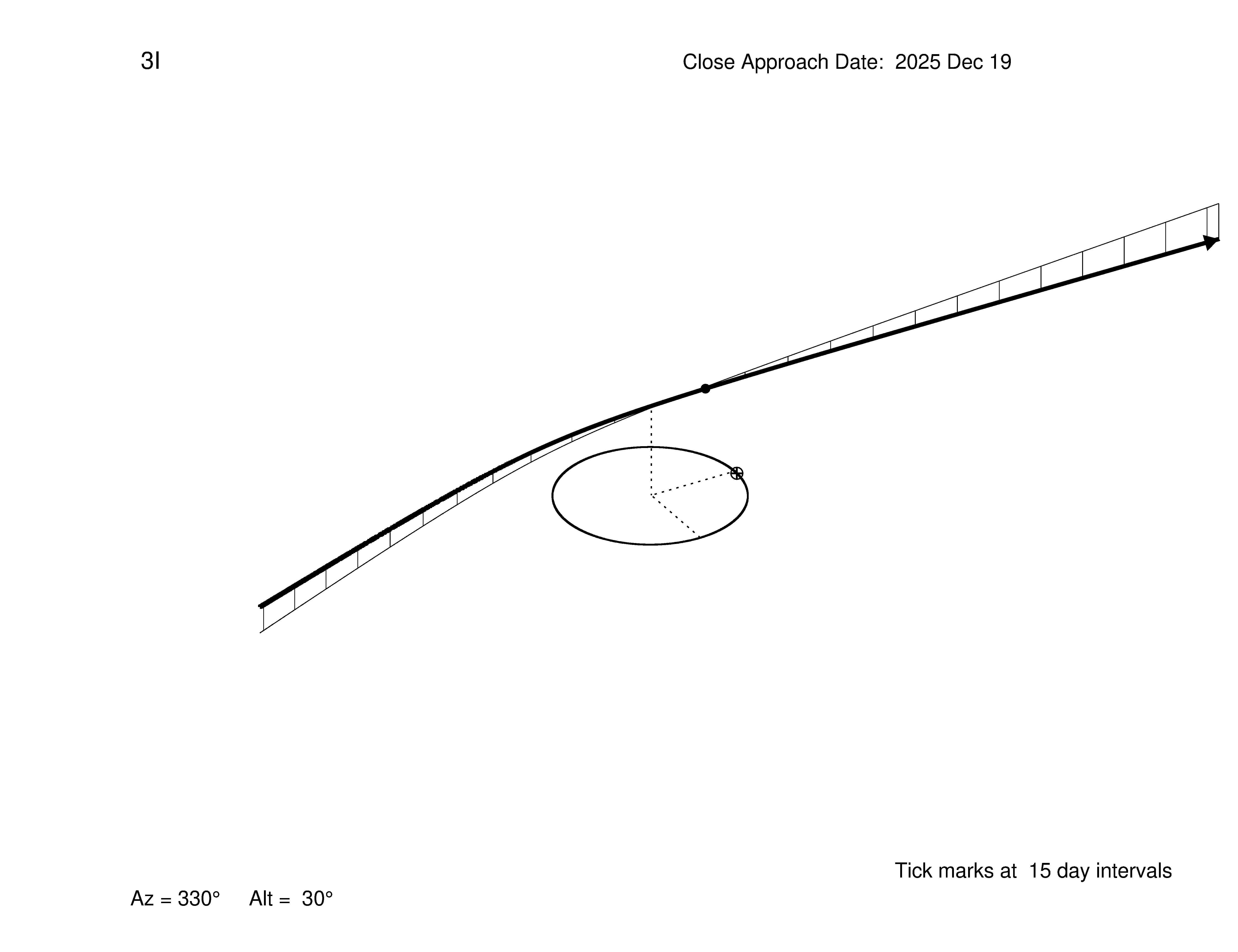 Oblique view of the portion of Comet 3I/ATLAS orbit around its MOID, viewed from 30° above the ecliptic plane. The black dots denote the positions when the comet is closest to the Earth.