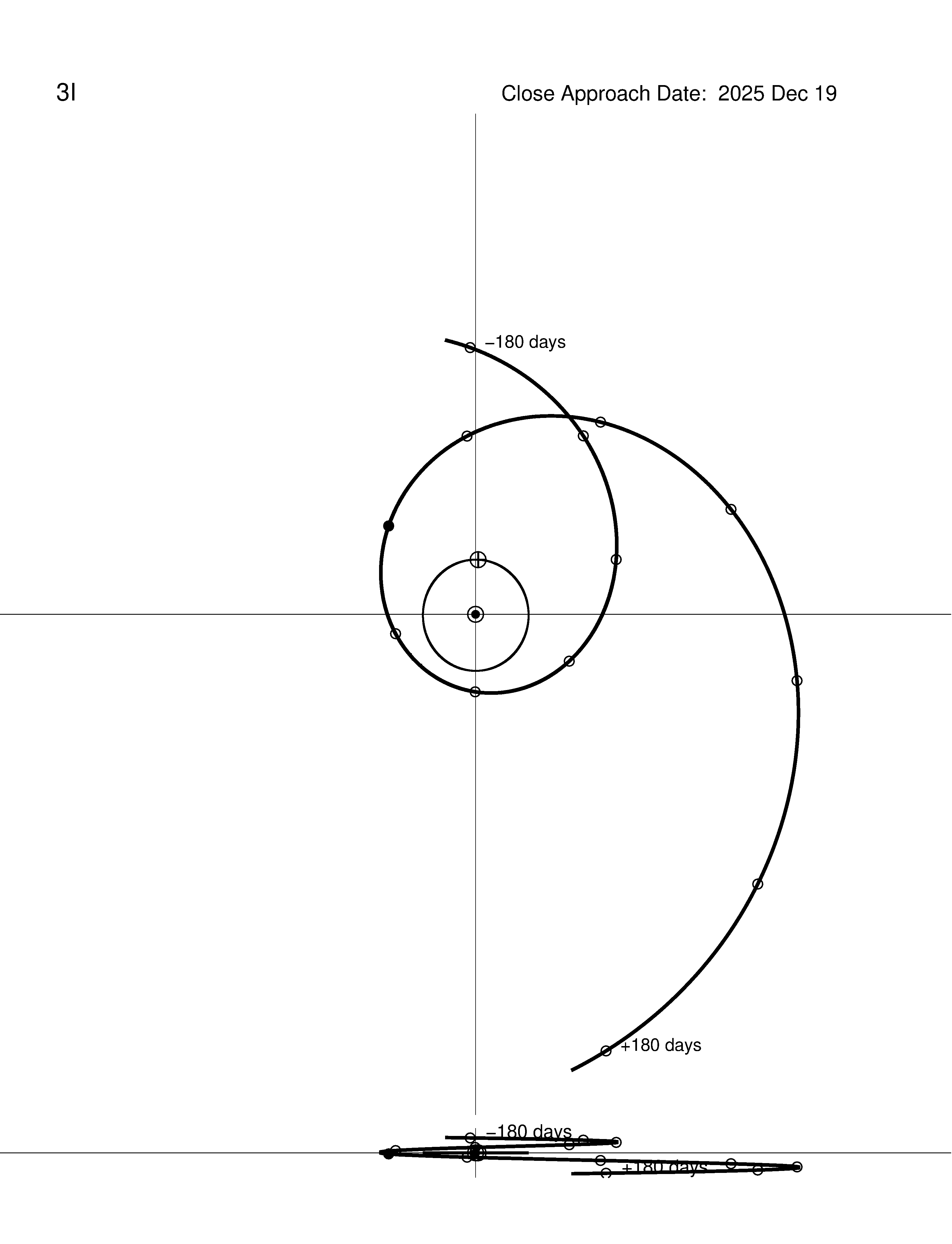 The orbit of Comet 3I/ATLAS around perihelion, in the Earth's co-orbital reference frame, as seen from above (top panel) and in the ecliptic plane (bottom panel). The black circle denotes the comet's position on Dec 19 2025, when it is closest to the Earth.